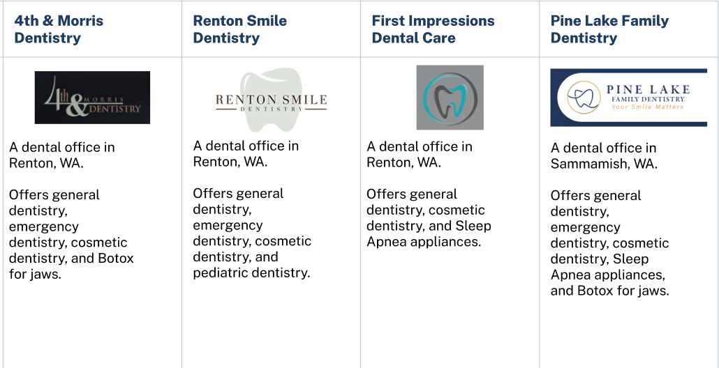 Making a Competitive Analysis for Fourth Morris, Renton Smile Dentistry, 1st Impression Dental Care, and Pinelake Family Dentistry provided insight on ideal feautres to include and what to omit.