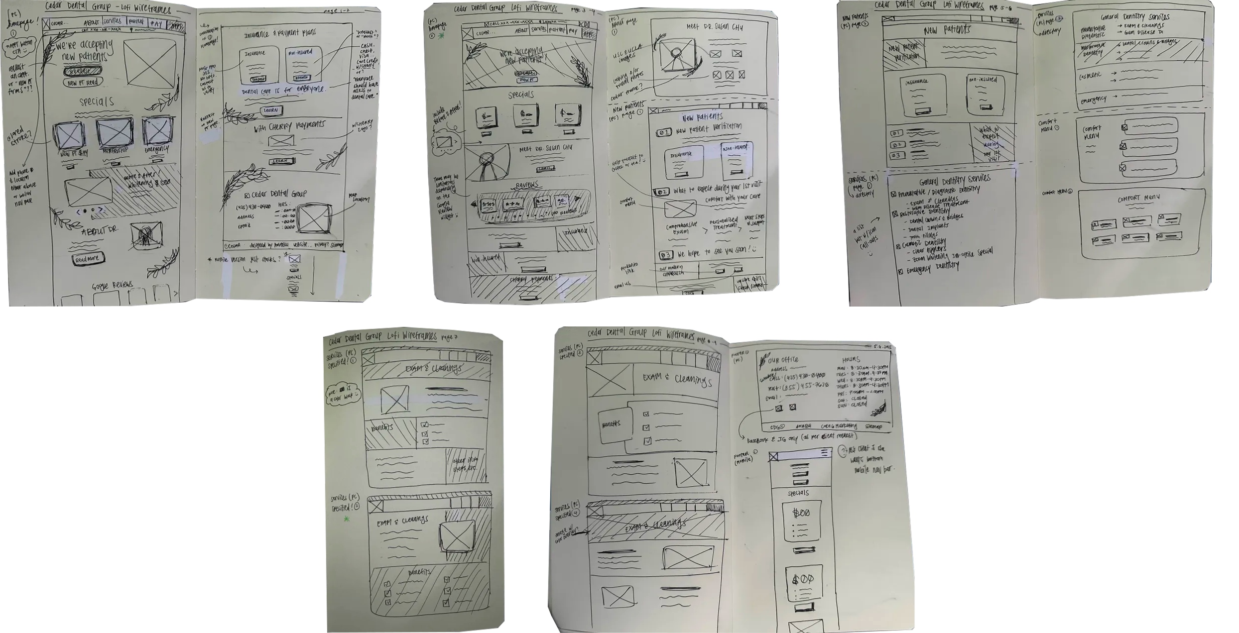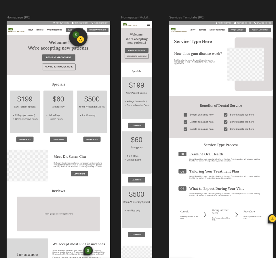 Quick sketches were insufficient to fully convey how I would redesign several of the Cedar Dental Group's website pages. The mid-fidelity wireframes helped me see how the layout would ideally look on a PC. This helped me narrow down which of my sketches worked and what didn’t.