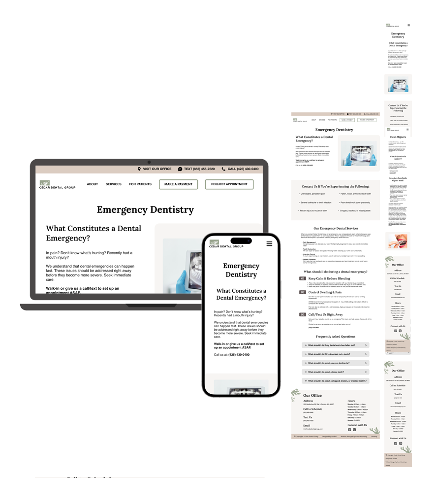 The Emergency Dentistry page lets patients know what Cedar Dental Group is able to address and guides them on the proper steps to address the situation temporarily.